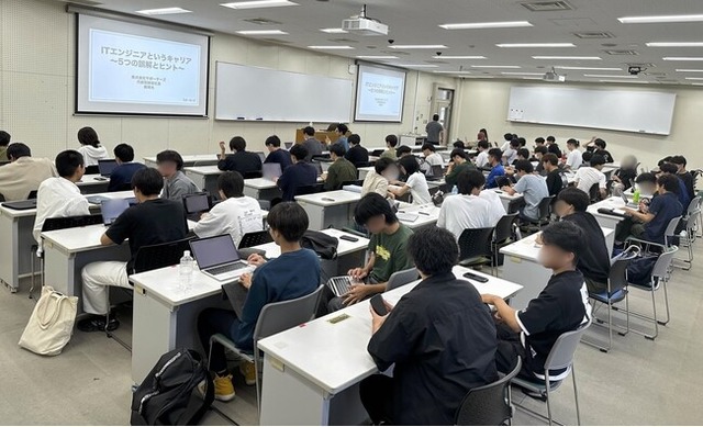 本講義は、学生のキャリア形成を支援する目的で、授業の一環として開講されたものです。4月に行われた、IT企業4社を招いた琉球大学工学部・サポーターズによる共同キャリアセミナーでは70名以上の学生にご参加いただき、よりエンジニア職のキャリアについて早期から考えるきっかけを提供すべく、琉球大学工学部1年生を対象とした講義を実施いたしました。