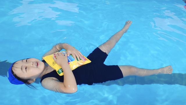 昨年から(株)湖池屋「ポテトチップス」をご協賛いただき、未開封のポテトチップスの袋を抱え、プールや海で浮く体験を行っています。ポテトチップスの袋には、空気が多く含まれるため、浮く練習に活用できます。子どもたちが大好きなポテトチップスを用いることで、楽しみながら浮く練習をしています。(穴が開くなどすると浮力は失われるため、救命用具にはなりません。)