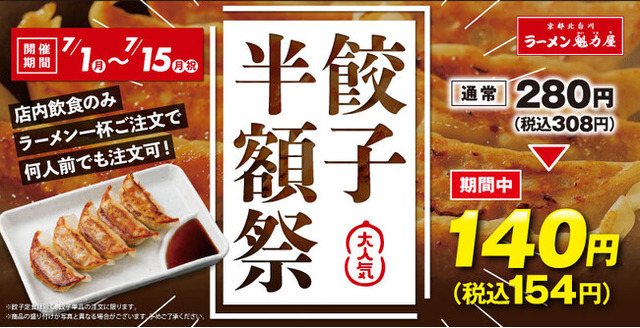 開催内容 : ラーメン1杯ご注文で「餃子(5ヶ)」が何人前ご注文いただいても一人前半額(140円(税込154円))でお召し上がりいただけます。