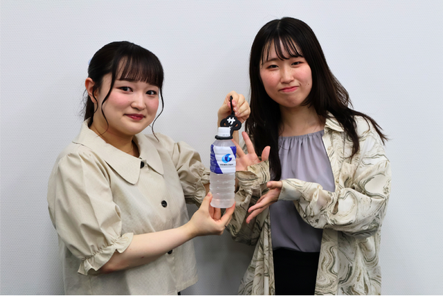 オリジナルのペットボトルホルダーを考案したのは、追大経済学部4年の木下梨理さんと村上千尋さんです。2人は「明光義塾の公式キャラクター『サボロー』を世の中に広めるグッズ」部門にエントリー。提案では、日本人の1人あたりの年間ペットボトル消費量が183本にも達するという調査に着目し、日常的に持ち歩くペットボトルをカバンなどに着けることで宣伝効果も期待できると、カラビナ付きのペットボトルホルダーを発想しました。