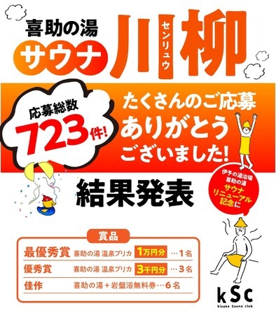 愛媛県松山市を拠点に展開する総合エンターテイメント企業、キスケ株式会社(代表取締役:山路義則)は、2024年5月3日から開催された「サウナ川柳コンテスト2024」の入賞作品を発表いたします。このコンテストには全国から723句の応募が寄せられ、参加者の皆様に心より感謝申し上げます。