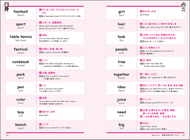 意味だけでなく、単語の使い方がわかるような用例や熟語なども学べます。
