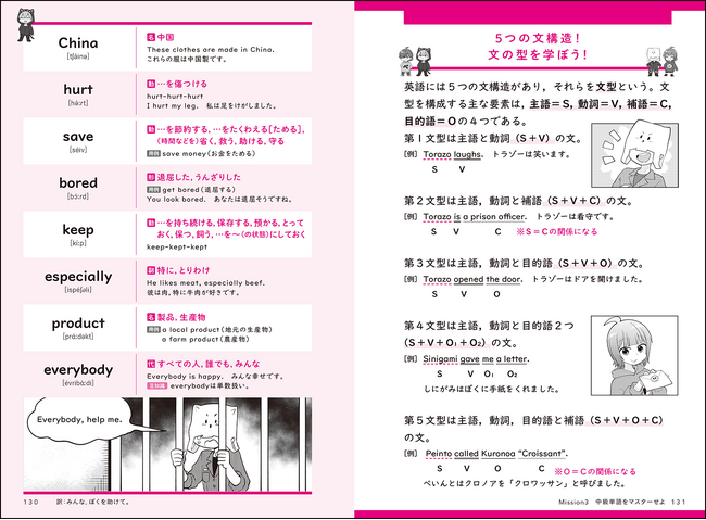 冒頭カラー漫画やイラスト、基礎文法解説、コラムも充実。超楽しく英単語&熟語が1800以上学べる英単語帳で、