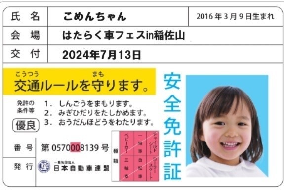 JAFブースではレッカー車展示のほか、交通安全クイズに答えて運転免許証そっくりのカードがもらえる「子ども安全免許証」の発行(先着100名)と、時速約5kmの衝撃体験でシートベルトの重要性が学べる「シートベルトコンビンサー」が体験できます。いずれも無料です。