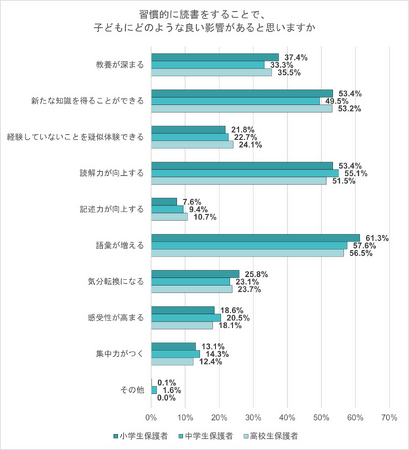小学生保護者・中学生保護者・高校生保護者とも、最も割合が高かったのは、「語彙が増える」だった。また、「新たな知識を得ることができる」「読解力が向上する」「教養が深まる」といった項目も、多くの保護者が、読書が子どもにもたらす良い影響だと考えているようだ。