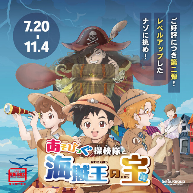 東大和市駅前にある複合型アミューズメント施設“BIGBOX東大和”(東京都東大和市)の屋内型キッズランド「あそびっぐ」において、2024年7月20日(土)から11月4日(月・振休)までの間、現在開催中の謎解きエンターテインメント第一弾「あそびっぐ探検隊と古代のガチャ」に続く、第二弾!『あそびっぐ探検隊と海賊王の宝』を開催いたします。