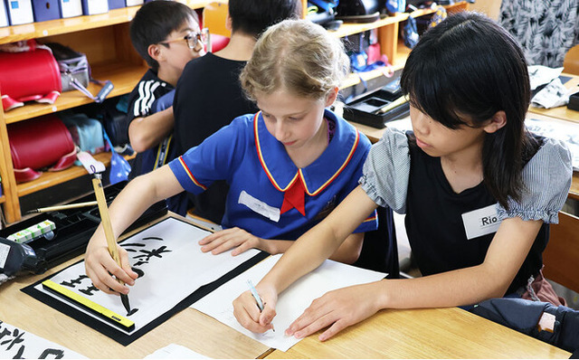 両校は、高槻市とオーストラリアのトゥーンバ市が姉妹都市連携を結んでいる縁から、令和5年10月に姉妹校提携を締結。今回、日本スタディツアーの一環で、ハイフィールズ州立学校児童団25人が郡家小学校を訪問し学校交流を行いました。当日、児童団は高槻市役所を訪問したあと郡家小学校に到着。郡家小学校児童全員にハイフィールズ州立学校の校歌合唱や琴の演奏で来校を歓迎されたあと、5・6年生の児童とともに習字やメンコなどの日本文化体験を行いました。児童団の子どもたちは、普段自国では体験することのない日本の文化に興味を持ち、郡家小学校の児童たちと共に楽しみながら授業を受けていました。