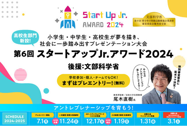 第6回目となる今年度からは高校生部門も新設し、国内における子どものプレゼンテーション教育とアントレプレナーシップの裾野をさらに拡げるべく、規模を拡大し新たなテーマで開催いたします。2024年度の開催テーマは「アントレプレナーシップ&ドリーム」~夢を描き、社会へ一歩踏み出そう!~です。小学生・中学生・高校生のみなさんが、こんな未来になったらいいなと思うことや夢に描いたこと。学校での学びや普段の生活の中で、ふと思いついたこと、感じたこと…。それをきっかけにぼんやりとアイデアが生まれた時、もう一歩行動に移してしてみませんか。その行動が未来を形づくることにつながるかもしれません。子どもたちのチャレンジを応援し、全国のこどもたちが気軽にエントリーできるプレゼンテーション大会、それが「スタートアップ Jr. アワード」です。
