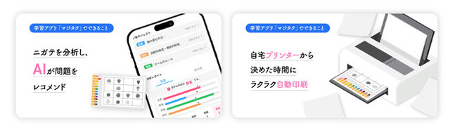 「マジタク」は、毎日のテストや週一回行う模擬試験の分析をスマホアプリで確認し、不得意分野を可視化。お子様一人ひとりに合わせて、今学習すべき問題をお勧めします。さらにご自宅のプリンターと連携し、アプリで設定した時刻にオリジナルの問題セットを自動印刷。自宅学習の最適化を図ります。