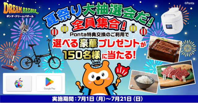 共通ポイントサービス「Ponta(ポンタ)」を運営する株式会社ロイヤリティ マーケティング(本社:東京都渋谷区、代表取締役社長:長谷川 剛、以下「LM」)は、2024年7月1日(月)~7月21日(日)、Pontaポイントを商品やポンタグッズと交換できる「Ponta特典交換」で、「Ponta Dream Bazaar(ポンタ・ドリームバザール)」を開催します。今回は「夏祭り大抽選会だ!全員集合!」をテーマに、豪華な商品を抽選でプレゼントします。