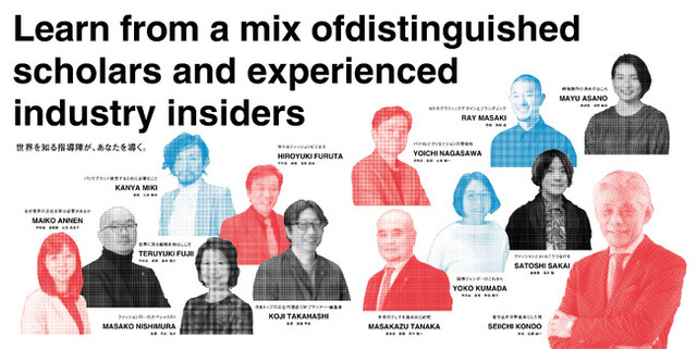 元文化庁長官で富士山の世界遺産登録に尽力した近藤学長をはじめ、パリでブランドを運営しパリコレに参加する教授、世界に誇る繊維産地を知り尽くす教授、日本トップの広告代理店CMプランナー・編集者である教授など、ファッションから文化までを網羅する指導陣がそろっています。
