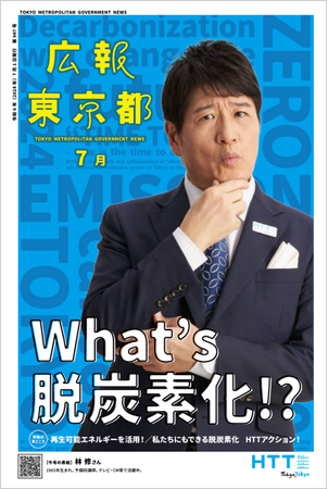 東京都では、都政や都民生活に必要な情報を伝えるため、広報紙「広報東京都」を毎月1日に発行しています。7月号は「What`s 脱炭素化」と題し、東京都が取り組む「脱炭素化」の施策と、私たちができる取り組みまでを幅広くご紹介 。昨年の広報東京都7月号に引き続き、予備校講師の林修さんを表紙に起用し、「脱炭素化」のポイントや東京都がすすめる電力を「HTT (Ⓗへらす・Ⓣつくる・Ⓣためる)」施策について解説していただいています。