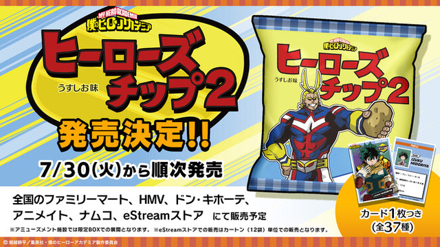 株式会社CyberZ(本社:東京都渋谷区、代表取締役社長:山内隆裕)は、TVアニメ『僕のヒーローアカデミア』より、「ヒーローズチップス2」の発売を決定いたしました。2024年7月30日(火)より、全国のファミリーマート、HMV、ドン・キホーテ、アニメイト、eStream Storeにて販売する他、株式会社バンダイナムコアミューズメントが運営する全国の直営アミューズメント施設「ナムコ」と「ナムコオンラインクレーン」では限定BOX仕様で順次展開いたします。