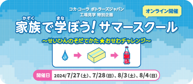 コカ・コーラ ボトラーズジャパン株式会社(本社:東京都港区、代表取締役社長 最高経営責任者:カリン・ドラガン、以下 当社)は、工場見学特別企画としてオンライン開催する「家族で学ぼう!サマースクール」の参加者募集を本日7月1日(月)より開始します。開催日は、2024年7月27日(土)、7月28日(日)、8月3日(土)、8月4日(日)の4日間、当社専用ページ(https://www.ccbji.co.jp/event/summerschool/)からお申し込みが可能で、各回80組(150-200名程度)の小学生以上のお子さまとそのご家族の方が対象となります。