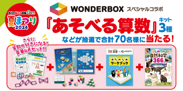 株式会社KADOKAWA(取締役 代表執行役社長 CEO:夏野剛、本社:東京都千代田区)は、2024年7月10日(水)に『角川の集める図鑑GET! あそべる算数』(監修:川島慶)を発売いたします。発売を記念して、「角川の集める図鑑GET! 夏まつり2024」の開催が決定いたしました。WonderBox(ワンダーボックス)スペシャルコラボ「あそべる算数キット3種」などが抽選で合計70名様に当たります。