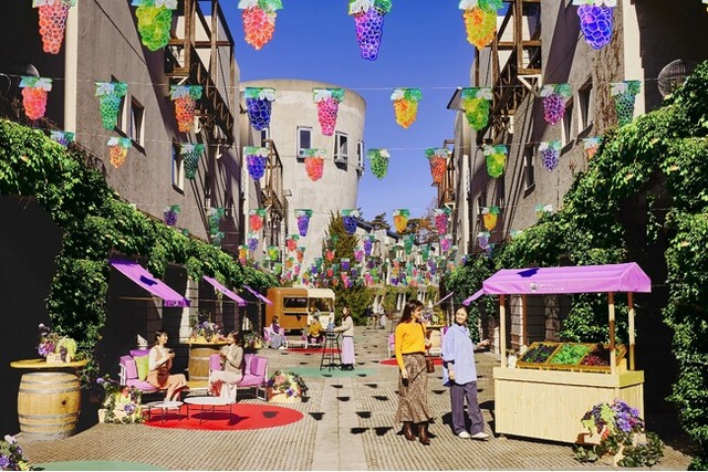 デラウエアや巨峰、シャインマスカットなど葡萄の品種ごとに異なる個性豊かな色や形の特徴を表現した30種類のフラッグが登場します。また、葡萄の色を表現した、オーニング(*2)やソファーも用意し、空間全体を葡萄を表現した色味で彩ります。高原の秋の心地良い気候の中、ソファで葡萄を味わったり葡萄の装飾の下でくつろいだりと、自由に過ごせる空間です。