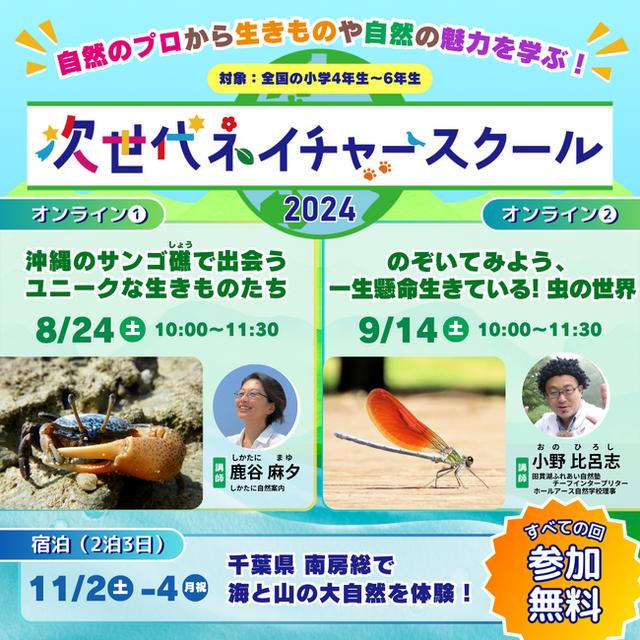 しかし、本来わたしたちの暮らす地球は、不思議でおもしろい自然にあふれています。そのような自然や生きものの魅力にふれることで、子どもたちが好奇心を育み、自ら疑問を見つけ、地球の未来について考えるきっかけとなる学びの場「次世代ネイチャースクール」を開講します。