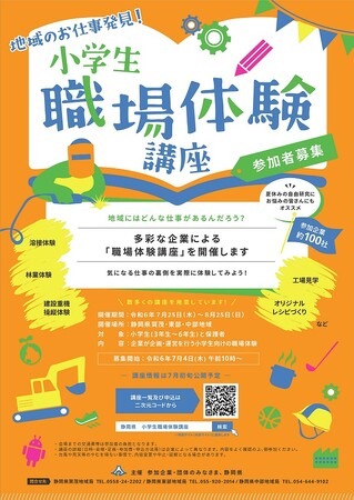 静岡県では、地域の企業・事業所の魅力を知ってもらい、将来の就業の選択肢の一つとなるように、企業紹介と職場体験を兼ねた「小学生職場体験講座」を開催します。小学生と保護者を対象とした当講座の参加者を募集します。