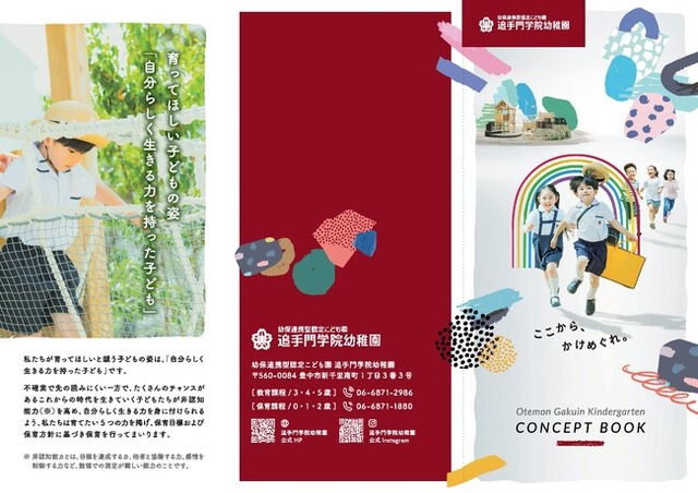 ものごとがめまぐるしく変化し、複雑で不確実なVUCA時代を迎えるなか、幼保連携型認定こども園追手門学院幼稚園(以下、こども園。大阪府豊中市、園長:田中真一)は、全教職員でのワークショップを通して「育ってほしい子どもの姿」と保育目標・保育方針を新たに策定し、このたびコンセプトブックを発刊しました。また、これに合わせて公式ホームページもリニューアルしました。