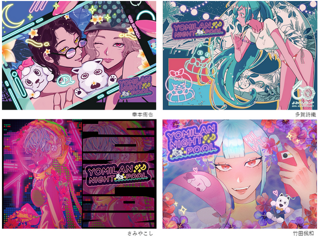 また、作品の一部は7月22日(月)~7月28日(日)の期間、小田急線下北沢駅のエスカレーター壁面に交通広告として展示します。ナイトプールのメインビジュアルと波のプールステージの装飾を担当したイラストレーター「電Q(https://www.instagram.com/denjinq/)」氏の作品も展示し、駅構内を華やかに彩ります。※期間中休場日あり