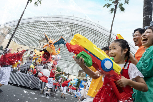 沿道の招待ゲストは、パレードがやってくると、パーク中の人気者が登場する圧倒的スケールのフロートの数々を大歓声で迎えました。「マリオ」と仲間たちのフロートでは、コインに向かってウォーターシューターを放ちコインを集めたり、“ポケモン”が集結するフロートでは、“みずタイプのポケモン”から水をかけられたりと無我夢中で楽しみました。パーク初となる、フロートからの豪快なウォーターエフェクトや、エンターテイナーの“超陽気”なパフォーマンスなど、夏ならではの“超爽快”なウォーターパレードで参加者全員が“いい顔”になって、今しかできないずぶ濡れ必至の“超熱狂体験”を子どもから大人まで満喫しました。