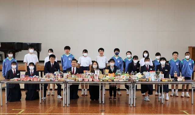 寄贈式は、パルシステム群馬の司会で進行し、寺尾中学校の生徒たち自身が呼びかけて集めたフードドライブ提供品をフードバンクまえばしへ手渡します。フードバンクまえばしは、連携団体による子ども食堂などでの寄贈食品の活用方法や背景にある地域の課題などを生徒たちに伝えます。生徒たちは、フードドライブの呼びかけから回収、集めた食品の賞味期限などの検品の過程や感想も報告し、ともに課題を話し合い、交流します。