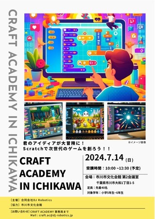 合同会社DJ Robotics(代表:齋藤立壽)は- 2024年7月14日(日)-千葉県市川市 市川市文化会館にてプログラミング教育イベント「Craft Academy in Ichikawa」を開催します。このイベントは、小学生(5~6年生)と中学生(1~3年生)を対象とし、次世代の技術者を育成することを目的としています。