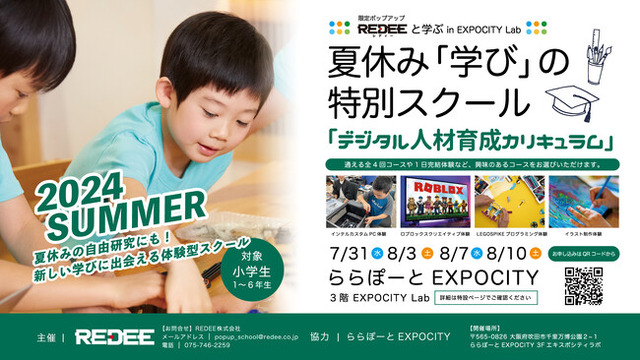 REDEE(レディー)株式会社(本社:京都市下京区、代表:代表取締役社長 密山 裕貴)はららぽーとEXPOCITYと協力し、ららぽーとEXPOCITY 3F EXPOCITY Labにて、2024年7月31日(水)・8月3日(土)・8月7日(水)・8月10日(土)の計4日間、『夏休み「学び」の特別スクール』を開講いたします。