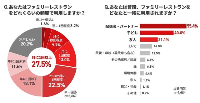 ファミリーレストランを誰と一緒に利用するかを聞いたところ、「配偶者・パートナー」が55.4%でトップでした。次に「子ども」(40.0%)でした。一方、「1人で」利用すると答えた人は14.8%にとどまりました。文字通り、家族で利用する人が多いことがわかります。3位には「友人」(21.1%)と、カジュアルな集まりの場としても活用されていることがわかります。