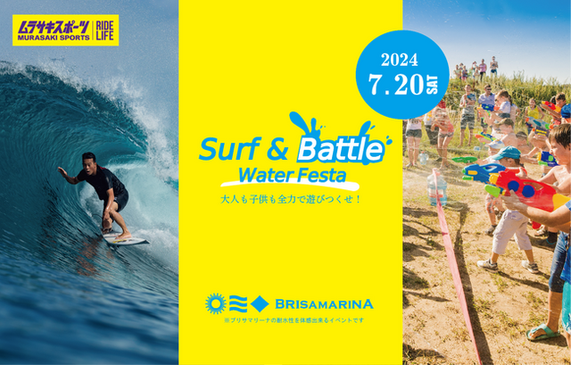 プロサーファー愛用の日焼け止め「ブリサマリーナ」の耐水性が体感でき、豪華景品ゲットを目指して楽しめるチーム対抗「水鉄砲バトル大会」と、トッププロサーファー達によるサーフセッションを間近で観覧出来る特別なイベントです!