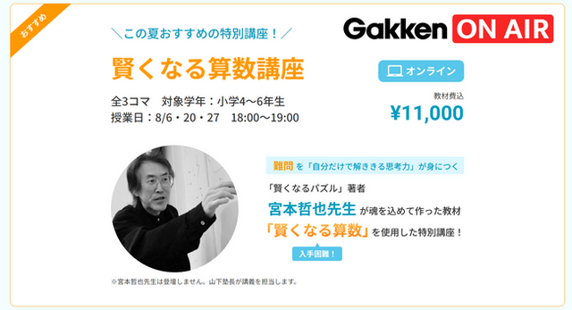 今年は小学校高学年を対象に、宮本哲也先生の『賢くなる算数』を使用した山下塾長による特別講座を開講する。