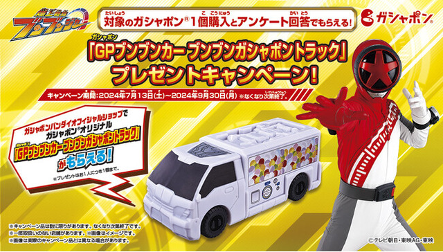 ガシャポンバンダイオフィシャルショップの対象店舗で、『爆上戦隊ブンブンジャー』のガシャポン付属のミニブック1枚と、キャンペーンアンケート回答完了画面をスタッフに提示すると、ガシャポンオリジナル「GPブンブンカー ブンブンガシャポントラック」がもらえます。