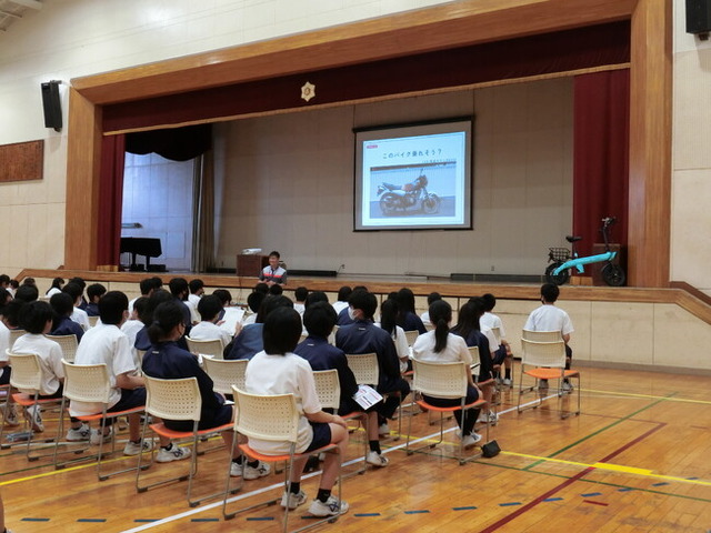 「まだ世界にない、感動をつくる。」をコーポレートミッションに掲げ、ビジョンである「バイクライフの生涯パートナー」の実現に向けて事業を展開する株式会社バイク王&カンパニー(代表取締役社長執行役員:石川秋彦、本社:東京都世田谷区、証券コード:3377以下「当社」)は、7月2日(火)に、綾瀬市立春日台中学校の1年生と2年生の生徒201名を対象に、働く楽しさやSDGsについて、出前授業を行いました。今回の出前授業の対象が中学生ということで、16歳から運転できる特例特定小型原動機付自転車の「e-FREE 01」も紹介しました。
