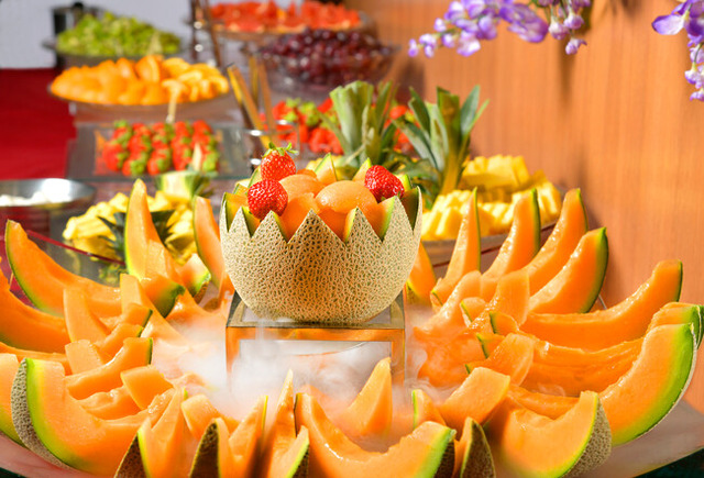 今回の「あま~い夏の収穫祭 フルーツ&スイーツビュッフェ」は、ランチタイムに赤肉メロンをはじめとした季節のフルーツやスイーツ各種、フードメニューなど全40種類以上のメニューをビュッフェ形式でご用意いたします。大人も子どもも楽しいチョコレートファウンテンでフルーツやケーキにチョコレートをからめたり、ソフトクリームマシーンを使ってメロンにソフトクリームをトッピングしたりするなど、お好きな組み合わせでお楽しみいただけます。さらにスイーツだけではなく、フードメニューやサラダバー、生ビール(別料金)もご提供いたしますので、ランチとしてもぜひご利用ください。