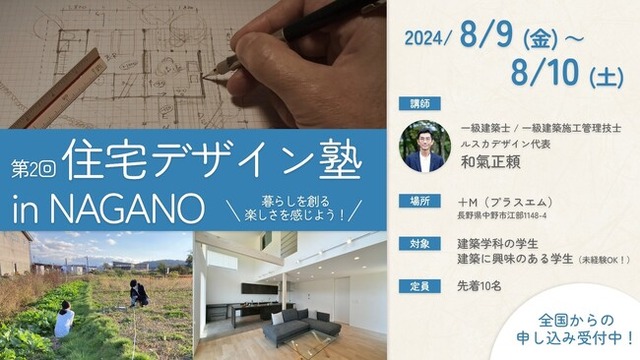 松村デザイン建築事務所(所在地:長野県野沢温泉村、代表取締役:松村 大介)と、建築デザイン会社 家印株式会社(所在地:富山県朝日町、代表取締役:坂東 秀昭)が共催し、住宅デザインの仕事の基礎知識や楽しさを伝える「住宅デザイン塾 in NAGANO」を学生向けに開講します(運営サポート:株式会社Asian Bridge)。