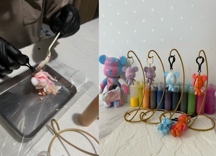 ポーリングアートとは、液体状にしたアクリル絵の具をキャンバスなどの上に流し、マーブル模様などのさまざまな色彩表現を生み出すアートで、イベントでは、オリジナルの「くまちゃんキーホルダー」を作ります。親子でのご参加をお待ちしています。