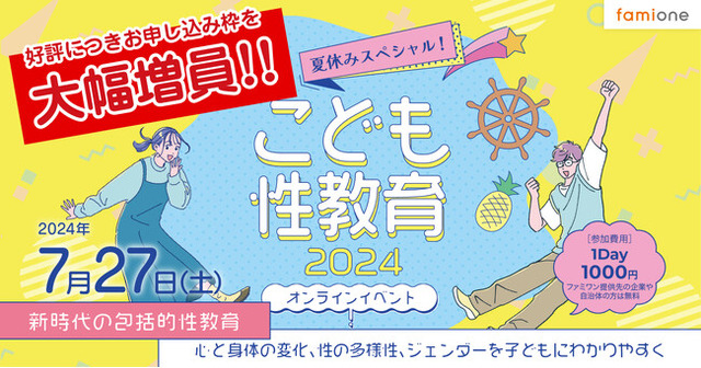「子どもを願うすべての人によりそい 幸せな人生を歩める社会をつくる」をビジョンに掲げ、法人の従業員向け福利厚生や自治体の住民向け支援を行うヘルスケアサポートサービス「ファミワン」 https://famione.com/benefit/ などを展開する株式会社ファミワン(本社:東京都渋谷区、代表取締役:石川勇介)は、2024年7月27日(土)に「夏休みスペシャル!こども性教育2024」オンラインイベントを開催します。