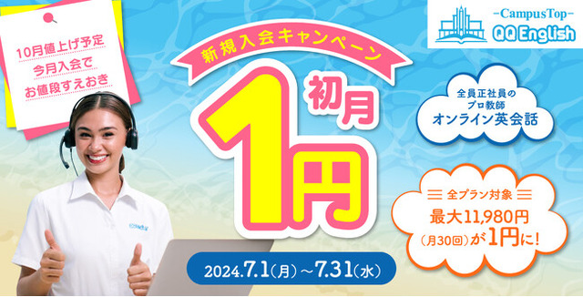 株式会社QQEnglish (本社:東京都渋谷区、代表取締役:藤岡 頼光)は、提供するオンライン英会話サービス「QQEnglish」「QQキッズ」にて、2024年7月1日(月)より「新規入会全プラン 初月1円キャンペーン」を開始したことをお知らせいたします。