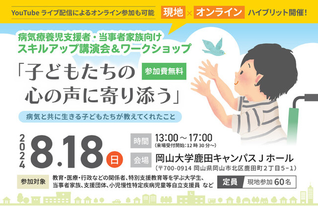 認定NPO法人ポケットサポート(岡山県岡山市、代表理事:三好祐也)は、2024年8月18日(日)に現地開催&YouTubeライブ配信にて『病気療養児支援者・当事者家族向けスキルアップ講演会&ワークショップ』を開催します。
