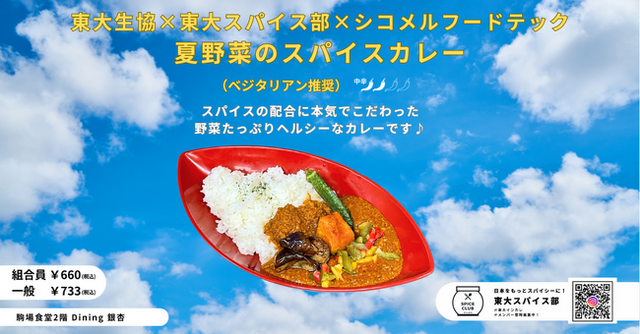 飲食店の仕込み問題を解決するアプリ「シコメル」を運営する株式会社シコメルフードテック(本社:東京都渋谷区、代表取締役CEO:川本 傑、以下当社)は、東京大学消費生活協同組合と東大スパイス部と協働で夏野菜のスパイスカレーを開発いたしました。当商品は東京大学の駒場キャンパスの学食2階『Dining 銀杏』にて数量限定で販売中です。