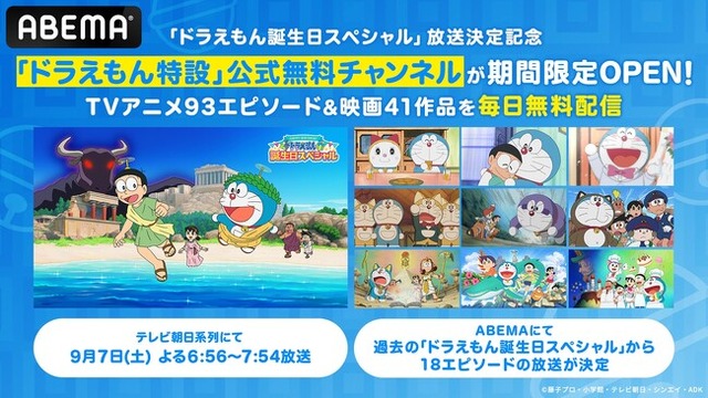 新しい未来のテレビ「ABEMA」は、地上波にて「ドラえもん誕生日スペシャル」の放送が決定したことを記念し、ドラえもんの誕生日に向け2024年7月6日(土)より、「ドラえもん特設」公式無料チャンネルを2024年9月8日(日)までの期間限定でOPENいたします。『ドラえもん』は、藤子・F・不二雄の大人気まんがを原作としたアニメ作品で、四次元ポケットから不思議な“ひみつ道具”を出す未来のネコ型ロボット・ドラえもんと、勉強もスポーツも苦手なのび太や仲間たちとの友情と日常が描かれます。TVアニメは45年以上にわたり放送される長寿アニメに。また、劇場版も数多く制作されており、今年3月にはシリーズ43 作目となる最新作『映画ドラえもん のび太の地球交響楽(ちきゅうシンフォニー)』が大ヒット上映されるなど、国民的アニメとして多くのファンに愛されています。このたび「ABEMA」にて新規OPENが決定した「ドラえもん特設」公式無料チャンネルでは、TVアニメ『ドラえもん』93エピソードのほか、『映画ドラえもん』41作品を65日間毎日ノンストップで無料放送。また、9月3日(火)のドラえもん誕生日より、過去の「ドラえもん誕生日スペシャル」18エピソードを編成する誕生日特別企画の実施も決定いたしました。「ABEMA」では、注目作品の公式無料チャンネルを今後も続々開設予定です。ぜひ「ABEMA」の「ドラえもん特設」公式無料チャンネルで、ドラえもんの誕生日に向け、これまでの名作の数々をたっぷりとお楽しみください。