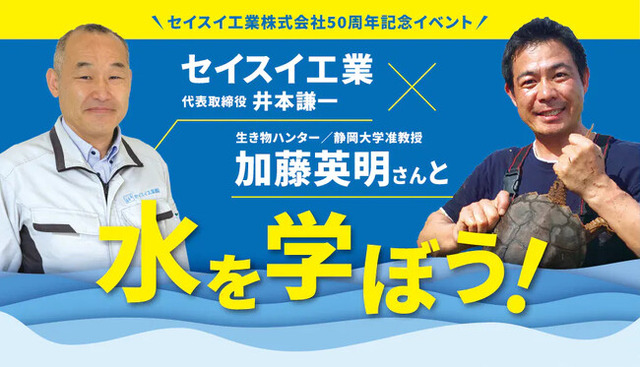 さまざまな現場環境に合わせて効果的な仮設水処理技術を提供するセイスイ工業株式会社(本社:千葉市若葉区、代表取締役:井本謙一、以下 セイスイ工業、https://seisui-kk.com)は、 50周年事業の一環として、8月6日に千葉市生涯学習センターにてトークイベント『セイスイ工業×生き物ハンター加藤英明さんと 水を学ぼう』(後援:千葉市教育委員会)を開催いたします。