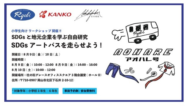 今回は、制服・体操服に関する「ものづくり」だけではなく、子どもたちのさまざまな夢と学びを応援するため、青木被服、両備バスと共同でワークショップを開催することになりました。ワークショップは、SDGsの目標12「つくる責任 つかう責任」をテーマに、地元企業のSDGsの取り組みや「つくる責任」について学び、参加者の皆さまと一緒に「つかう責任」や「今自分にできること」を考える内容を予定しています。夏休みの親子の思い出や、自由研究の題材にもご活用いただけます。