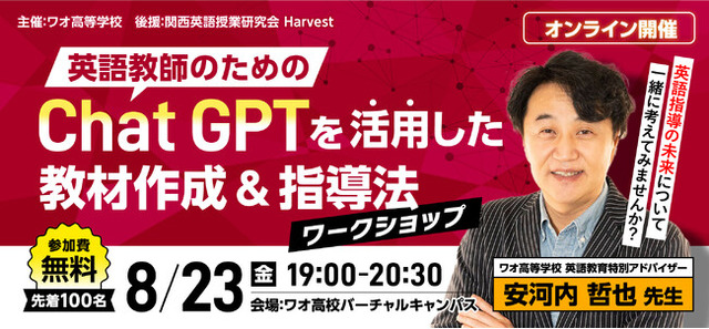 このたび、ワオ高校では、グローバル時代の教育の現場で苦心されている、英語教師の皆さまに向けて、「英語教師のためのChat GPTを活用した教材作成&指導法ワークショップ」を8月23日(金)に開催することを決定しましたのでご案内いたします。
