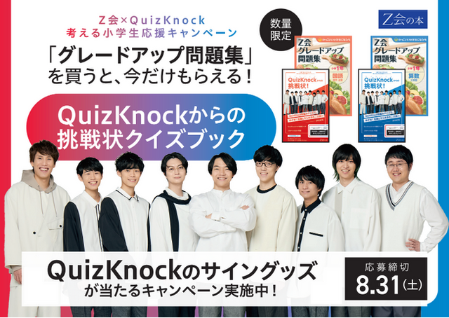 株式会社増進会ホールディングス(Z会グループ)のグループ会社、株式会社Z会ソリューションズは、株式会社batonが運営する東大発の知識集団「QuizKnock」と協力して、夏休みにがんばる小学生を応援するキャンペーンを実施します。キャンペーン帯が巻かれたZ会の小学生向け書籍を購入いただいた方には、オリジナルグッズを提供いたします。また、購入者限定で、QuizKnockのサイングッズが抽選であたるキャンペーンも実施!ぜひふるってご参加ください。
