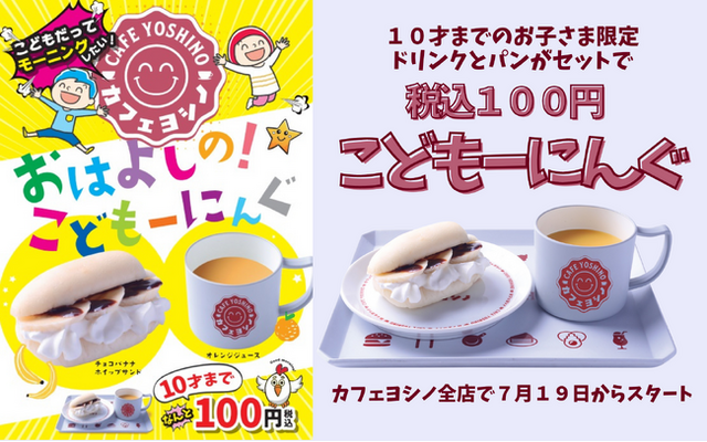 愛知県内に17店舗を展開する喫茶チェーン「カフェヨシノ」は、夏休みを目前にした7月19日(金)より、10才以下のお子さまを対象に、ドリンクとパンをセットにして税込100円で提供する『こどもーにんぐ』をカフェヨシノ全店でスタートします。