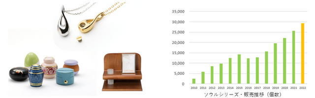いつでも身近に故人を偲ぶことができるよう、遺骨や遺灰の一部を納める手元供養は新しい供養のスタイルとして近年、消費者から関心が高く、市場規模も年々拡大し大変注目されています。その手元供養商品の中でもメモリアルアートの大野屋の身に着けるジュエリータイプの「Soul Jewelry(ソウル ジュエリー)」、デザインされた小さな骨壺「Soul Petit Pot(ソウル プチポット)」、「Soul Stage(ソウル ステージ)」の3ブランド「ソウルシリーズ」は、2010年 販売開始以来、累計出荷個数20万個を突破し手元供養商品のトップブランドとして大変多くの方々にお使い頂いております。