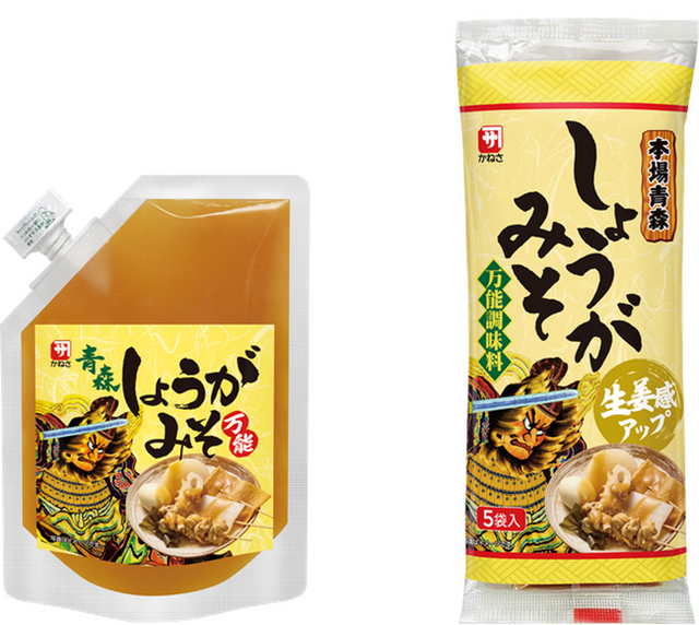 国産しょうがの香りと甘みにこだわりました。素材本来の味を楽しめるように、うま味調味料を使っていません。旨みと甘みを引き出す煮切り本みりんを使用。青森名物「しょうがみそおでん」のほか、さばの味噌煮やしょうが焼きなど、さまざまな料理にアレンジできる、万能しょうがみそです。新発売のスパウトタイプ「かねさ 万能しょうがみそ」と、小分けで便利な5袋入り「かねさ 本場青森しょうがみそ」は生姜感をアップしました。