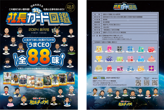 「社長を味わおう」をスローガンに「社長チップス!」を活用した社長プロデュースを行う、社長チップスエンタテイメント株式会社(所在地:東京都渋谷区、代表取締役会長:西川世一、取締役社長:西川真理子) は、全国の社長がカードになった「社長カード」をズラリと掲載し、仕事図鑑として楽しむことができる「社長カード図鑑 2024 創刊号」を日本で初めて発刊したことをお知らせします。「社長カード図鑑」は、全国の学生に届けられ、将来の職業や働き方について考えるきっかけを提供します。