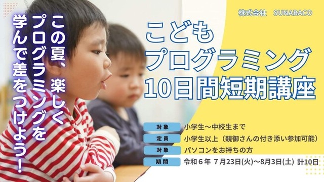 【挫折率1%以下・年間受講者500名以上】のプログラミングスクールを展開している、株式会社SUNABACO(本社:熊本県八代市)が、夏休み期間限定で「こどもプログラミング10日間短期講座」を開催いたします。
